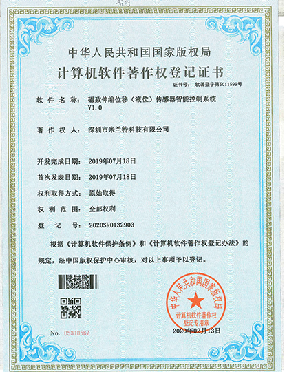 Software copyright registration certificate of Milont magnetostrictive displacement sensor intelligent control system V1.0